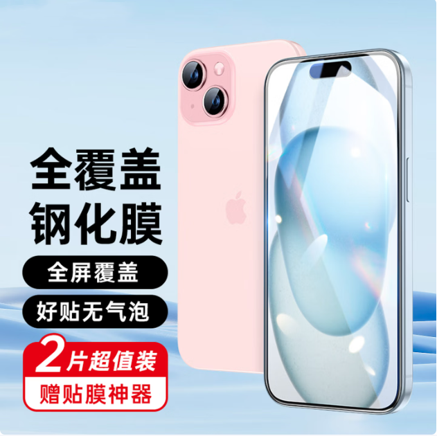 包装清单:iPhone 15 全覆盖 高清 钢化玻璃膜*2,贴膜神器*1,贴膜辅助工具包*2